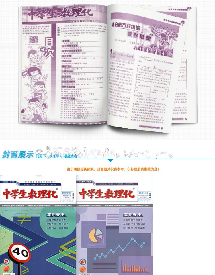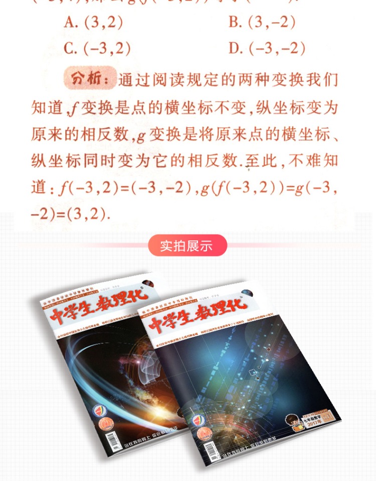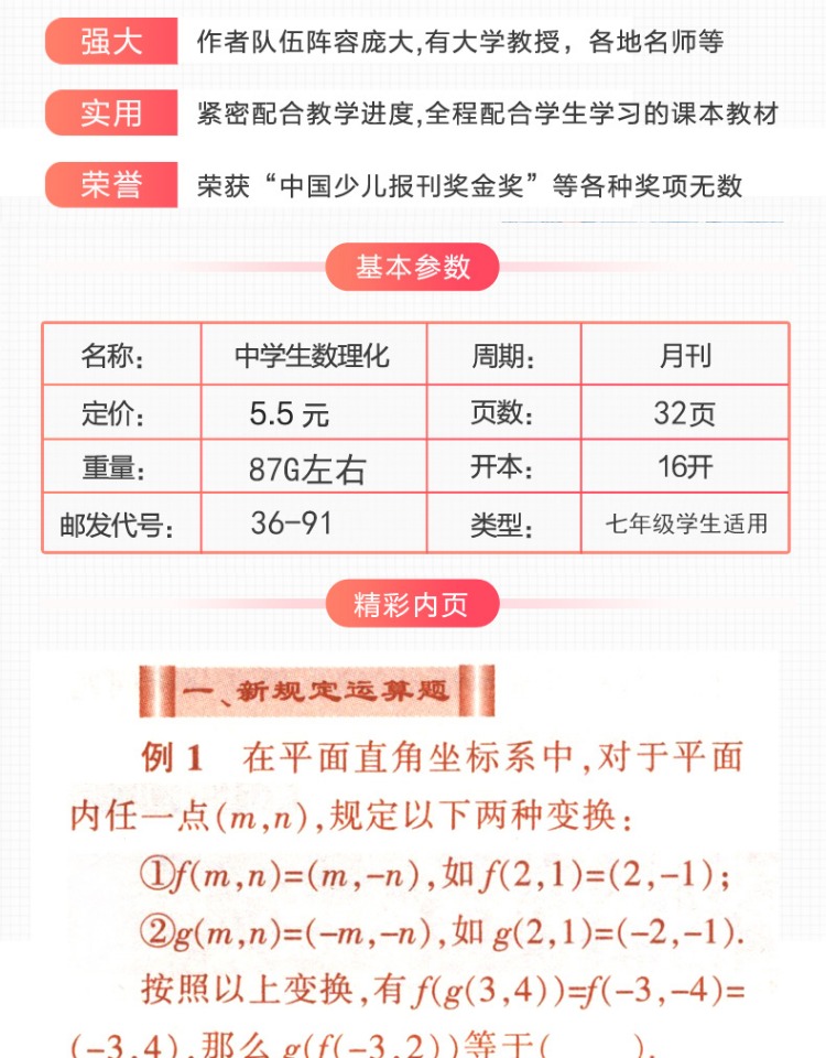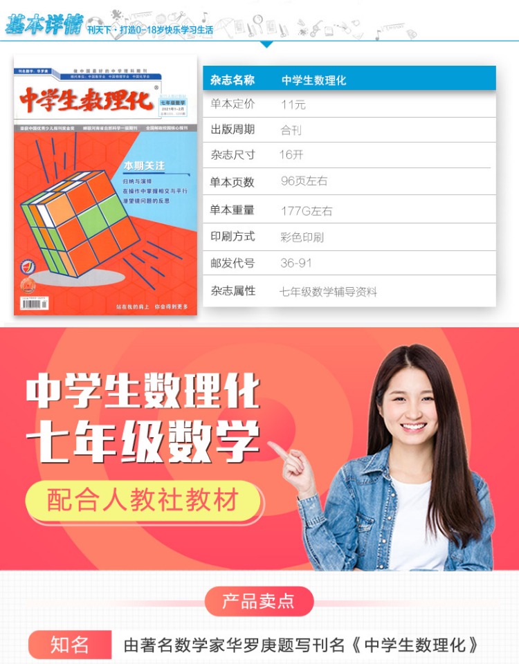 《中学生数理化》创刊于1981年10月,刊名由著名数学家华罗庚题写,吴文俊、陈景润、钱三强、苏步青、周光召、钱伟长、白春礼等50多位院士为本刊撰文或题词。世界著名物理学家、诺贝尔奖获得者李政道先生为本刊题词:“学好数理化,一生能创新”。《中学生数理化》一贯坚持以为素质教育服务、帮助中学生打好数理化基础为宗旨,以打造权威、经典、实用的精品报刊为原则,努力体现“贴近课堂教学实际,贴近学生学习和生活实际”的特点,精心创造“让老师省心、家长放心、学生开心”的精神食粮,融知识性、科学性、趣味性、新颖性、实用性于一体,深受老师和学生喜爱。《中学生数理化》曾蝉联两届全国优秀科技期刊奖和六届河南省优秀科技期刊奖,2007年获得了第三届中国优秀少儿报刊奖金奖,2008年荣获河南省第一届自然科学“二十佳”期刊称号。《中学生数理化》高中各年级版,以全程备考理论为指导,坚持从高考的角度,强化知识的梳理和方法的总结,透彻剖析考试重点,准确分析高考趋势,全面把握考试信息,能培养学生全程备考的学习理念,使学生掌握全程备考的实战方略。《中学生数理化》为配合素质教育,培养学生的参与意识和表现欲,各年级版每期都举办了丰富多彩的竞赛活动,如数学潜能知识竞赛、数学系列知识竞赛等。知识就是力量,参与就是胜利。
