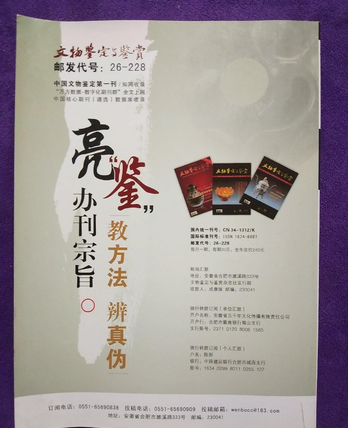 《文物鉴定与鉴赏》杂志是一份由安徽省出版集团主管主办的收藏鉴赏类刊物。该刊于2010年3月正式出版,其国内统一刊号为CN34-1312/K。杂志特色:《文物鉴定与鉴赏》杂志是面向国内收藏界发行,以宣传传统鉴定、科技鉴定相结合的“双轨鉴定”为基本内容,倡导“文物科技”为特色的文物鉴定、收藏鉴赏类杂志。它以大量的科学性、科普性、知识性文章为主要内容,多层面贴近读者;它广纳国内外最新文物收藏类热点新闻,捕捉发现第一线珍贵信息,打造一流的收藏鉴赏类刊物。
