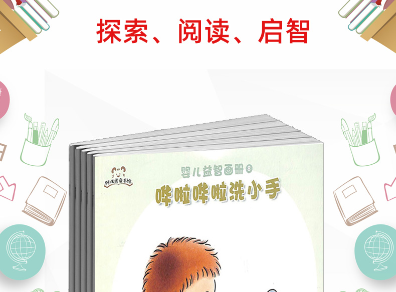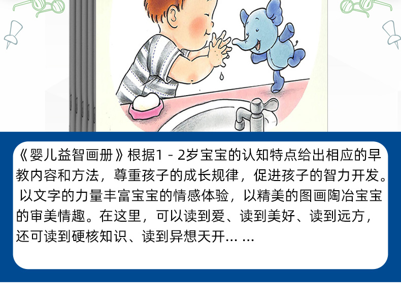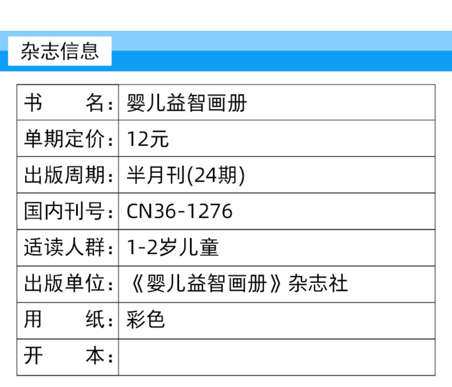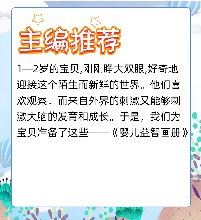 《婴儿益智画册》(综合版)是根据0-3岁宝宝的生理、心理发展,设计符合该年龄段婴儿认知能力的故事和游戏,让宝宝在启蒙之时,就能全方位地开发智能。该画册下设麦麦狼安全故事、绘本识字故事、手指操、亲子游戏、儿歌呱呱呱、益智游戏等板块,每月还有相关贴纸赠送,让宝宝在玩乐中开发潜能,真正做到寓教于乐。婴儿益智画册绘本版 《婴儿益智画册》(绘本版)以文字的力量丰富宝宝的情感体验,以精美的图画陶冶宝宝的审美情趣。在这里,可以读到爱、读到温情、读到美好、读到幽默、读到异想天开……
