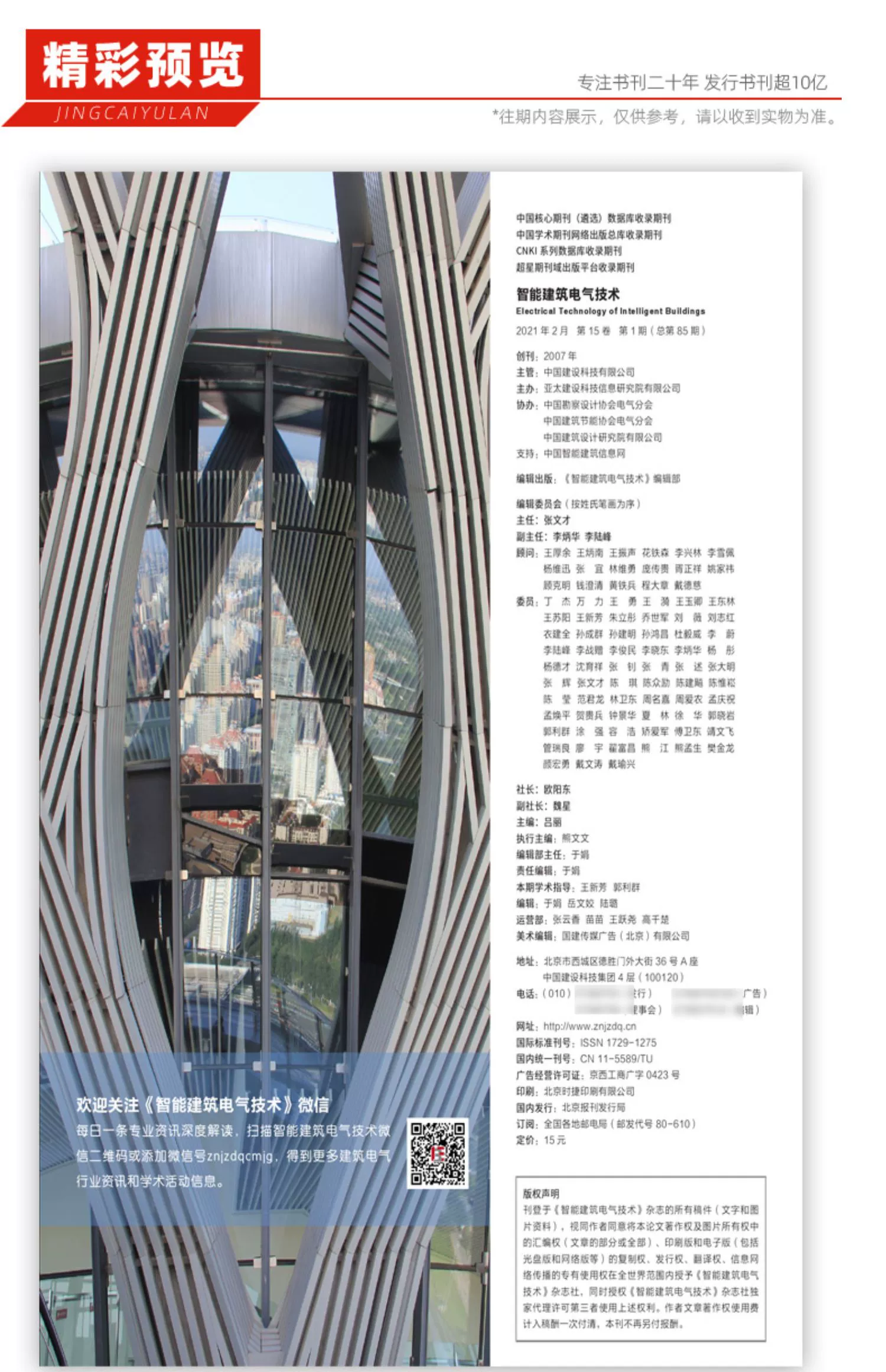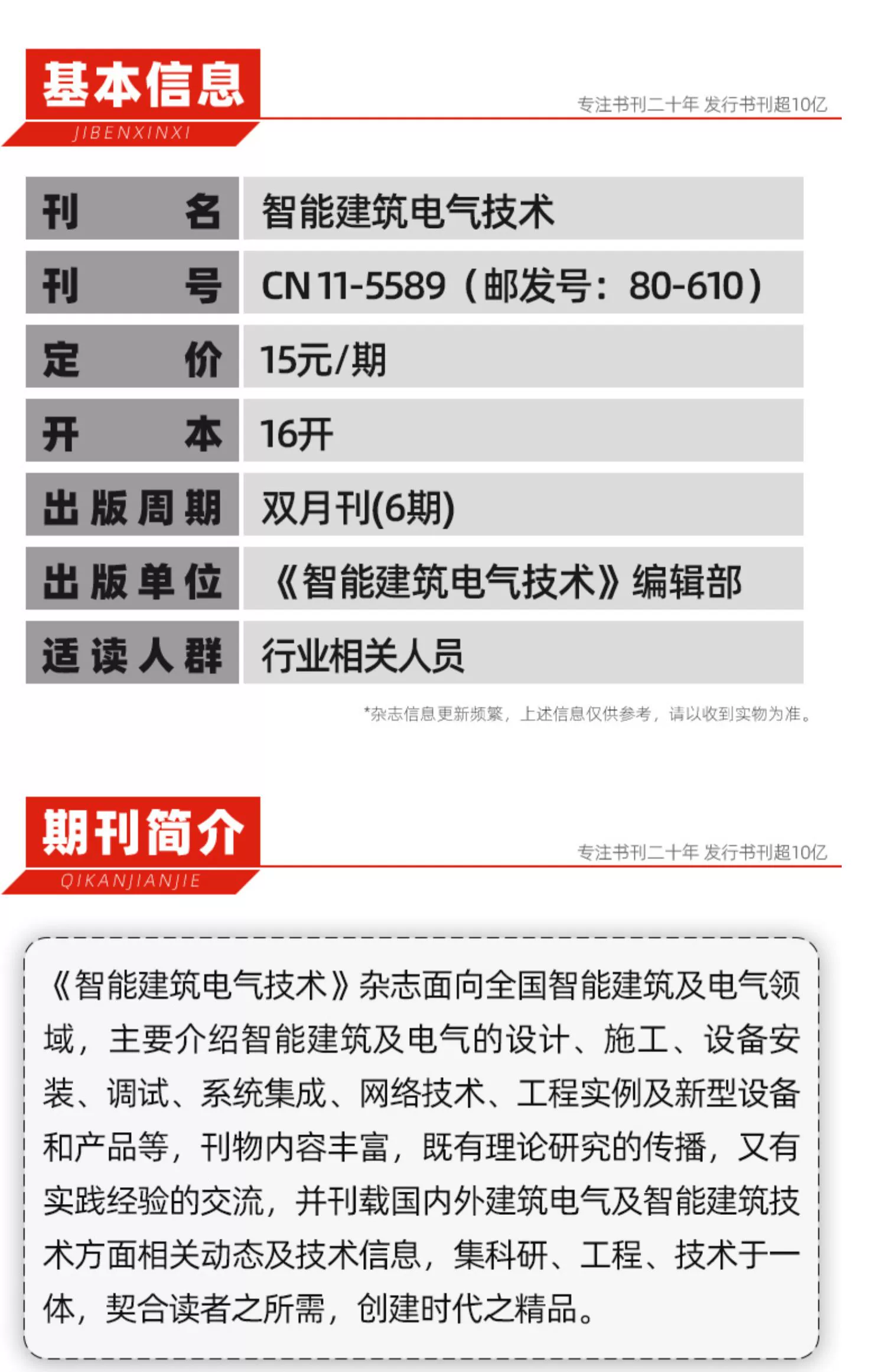 《智能建筑电气技术》(双月刊)创刊于2002年,是由中国建筑设计研究院主管、亚太建设科技信息研究院主办、入选《中国核心期刊(遴选)数据库》的综合性专业国家级正式技术刊物。《智能建筑电气技术》杂志面向全国智能建筑及电气领域,主要介绍智能建筑及电气的设计、施工、设备安装、调试、系统集成、网络技术、工程实例及新型设备和产品等,刊物内容丰富,既有理论研究的传播,又有实践经验的交流,并刊载国内外建筑电气及智能建筑技术方面相关动态及技术信息,集科研、工程、技术于一体,契合读者之所需,创建时代之精品。