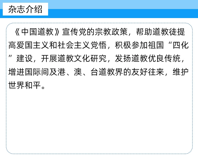 《中国道教》宣传党的宗教政策,帮助道教徒提高爱国主义和社会主义党悟,积极参加祖国“四化”建设,开展道教文化研究,发扬道教优良传统,增进国际间及港、澳、台道教界的友好往来,维护世界和平。