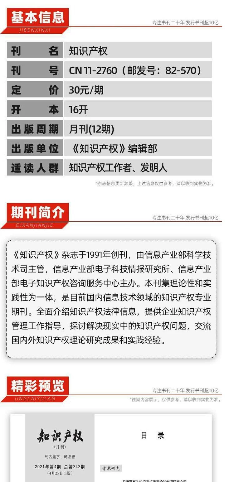 《知识产权》杂志于1991年创刊,由信息产业部科学技术司主管,信息产业部电子科技情报研究所、信息产业部电子知识产权咨询服务中心主办。本刊集理论性和实践性为一体,是目前国内信息技术领域唯一的知识产权专业期刊。 《知识产权》全面介绍知识产权法律信息,提供企业知识产权管理工作指导,探讨解决现实中最新的知识产权问题,交流国内外最新知识产权理论研究成果和实践经验。 《电子知识产权以满足企业知识产权工作需求为目标,建立了信息产业界与知识产权立法界、学术界以及司法界之间的桥梁,对推动国家和企业开展知识产权工作和促进中国知识产权事业发展,起到了积极的作用。