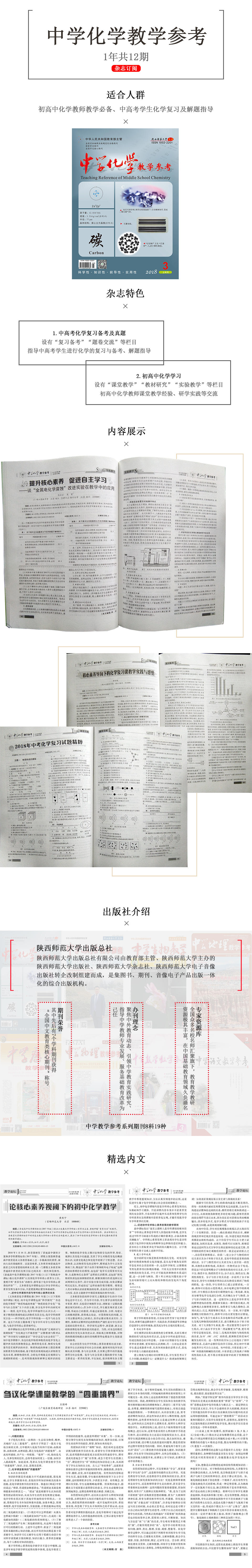 《中学化学教学参考》(半月刊)创刊于1972年,由中华人民共和国教育部主管,陕西师范大学主办,CN刊号为:61-1034/G4,自创刊以来,颇受业界和广大读者的关注和好评。