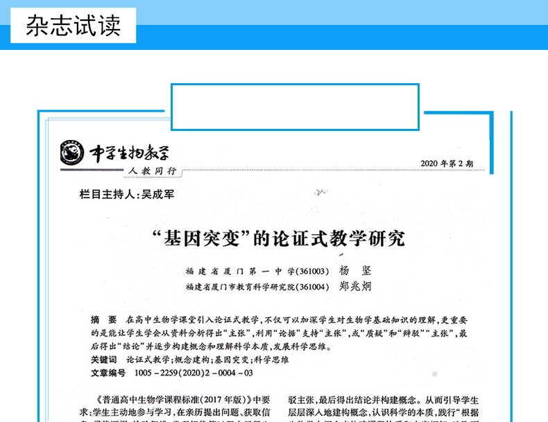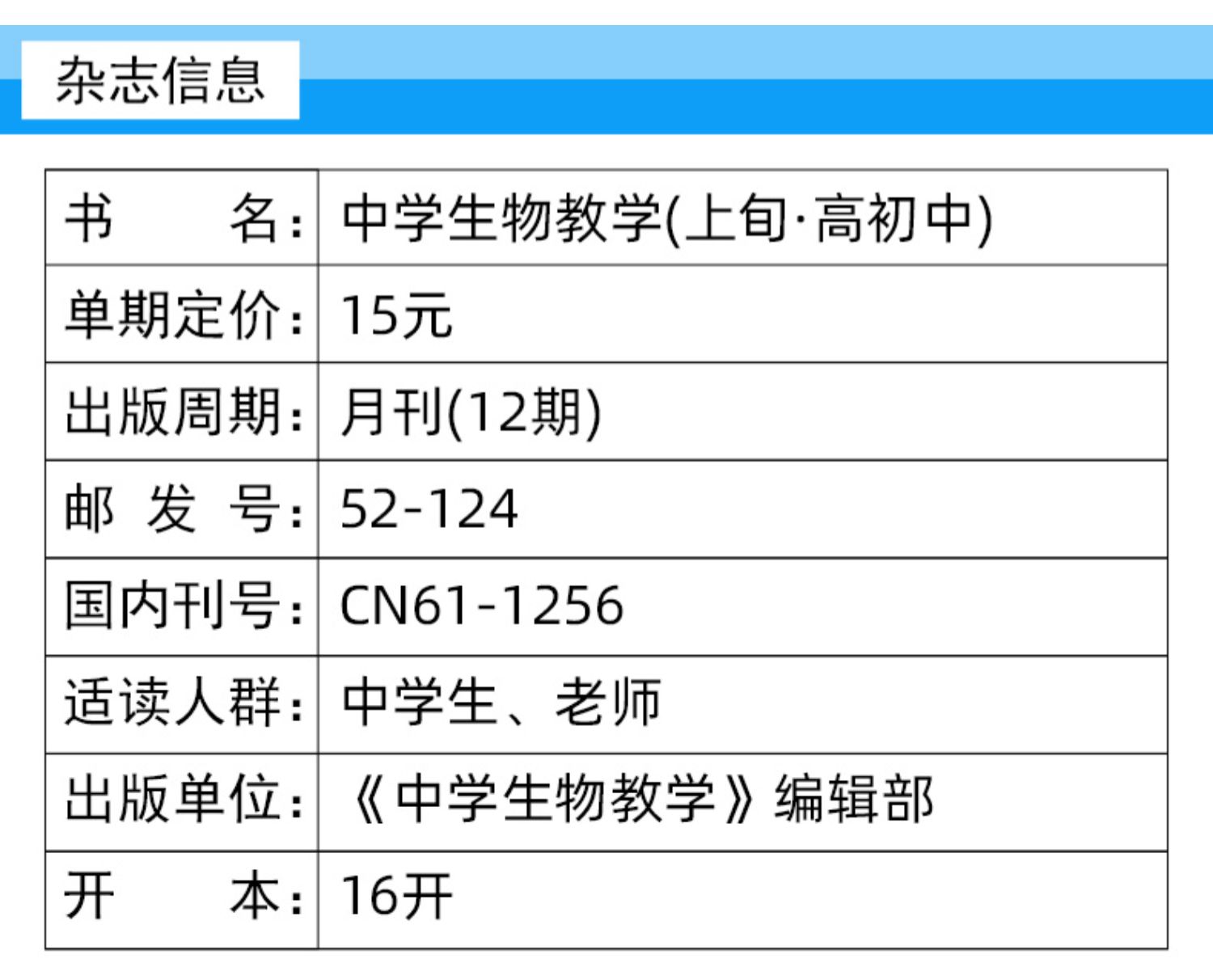 《中学生物教学》杂志是由中华人民共和国教育部主管、陕西师范大学主办的一份中等教育类教学期刊。