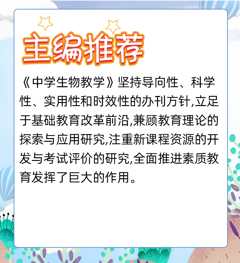 《中学生物教学》自创刊以来,始终秉承为中学生物教学服务、为提高中学生物教师的专业化水平服务的办刊宗旨,坚持导向性、科学性、实用性和时效性的办刊方针,立足于基础教育改革前沿,兼顾教育理论的探索与应用研究,倡导学术争鸣与创新实践,注重新课程资源的开发与考试评价的研究,全方位展示基础教育改革的进程,为指导和提高中学生物教学质量,促进生物教学改革,全面推进素质教育发挥了巨大的作用。