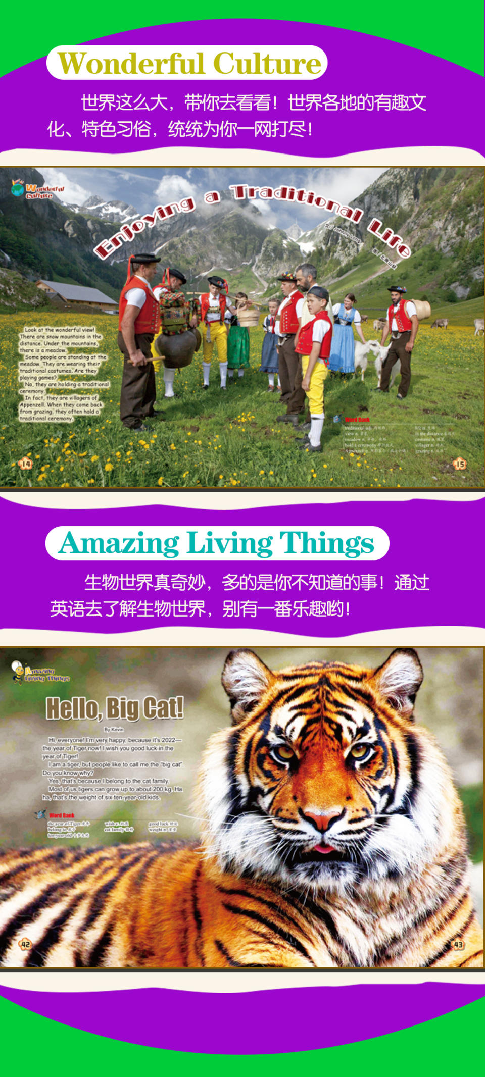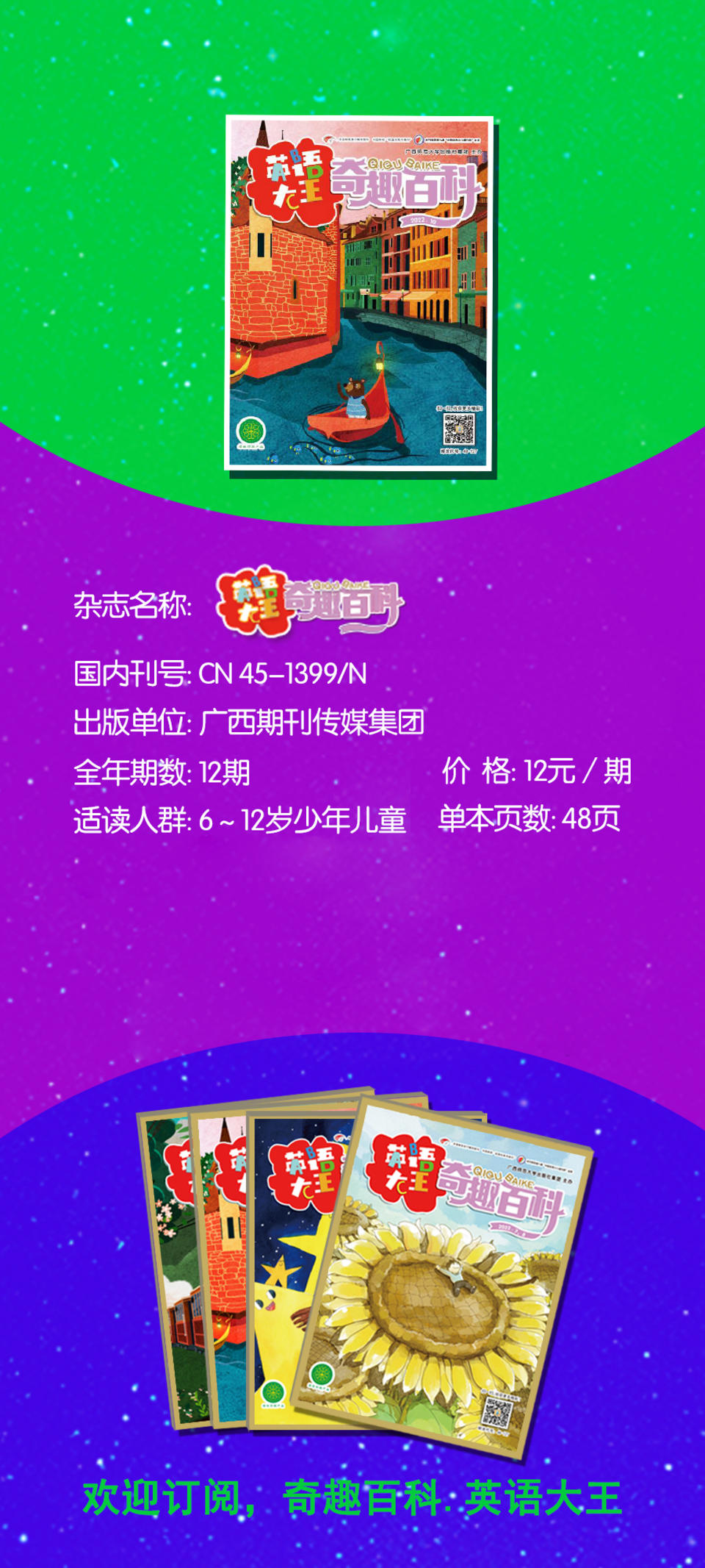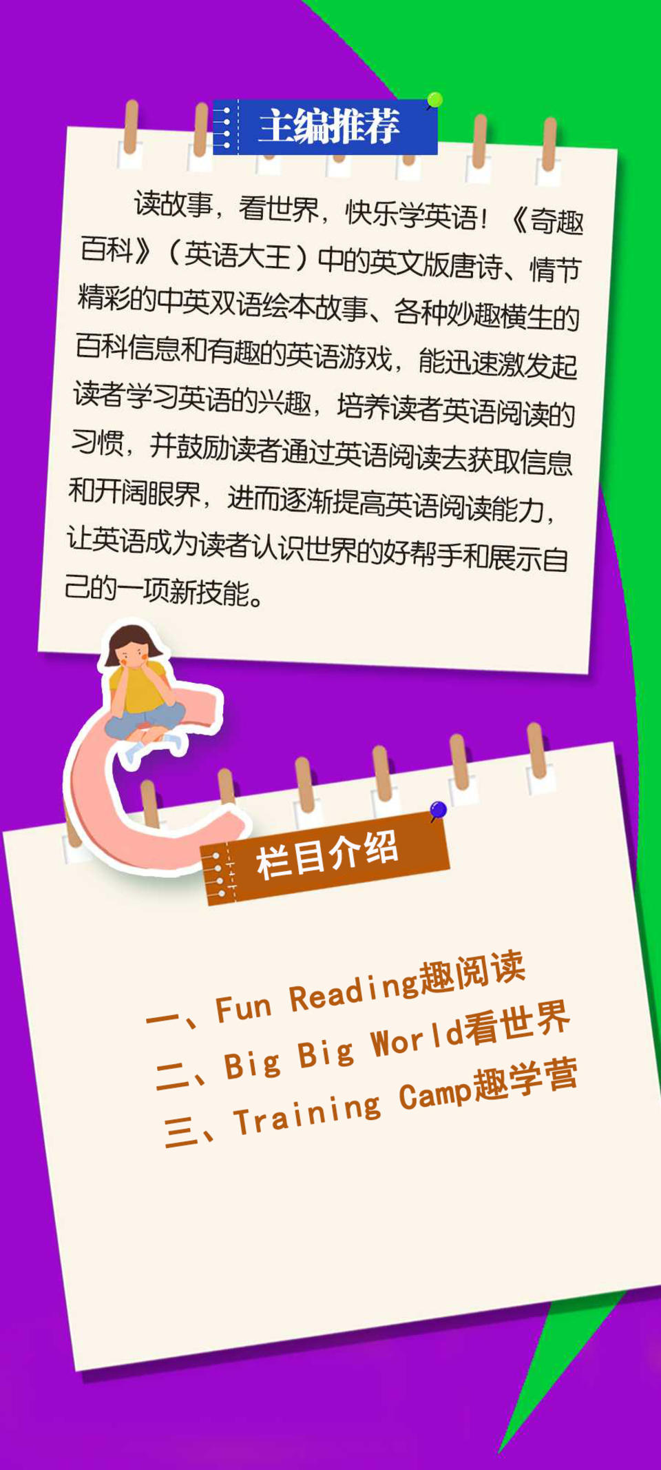 《英语大王》是由广西师范大学出版社主办的探秘自然的英语学习刊物,面向小学中高年级学生,以故事、漫画、笑话能趣味内容,融合小学生需要掌握的知识点,具有情境教学功能和课外阅读功能,注重时尚性和趣味性,读者参与性强,注重读者互动,既反应了最新的英语教研成果,又具有趣味阅读类英语期刊的可读性,是以华裔中小学生为主体组成的记者站遍布各大洲,是小学英语课堂教学的好帮手。