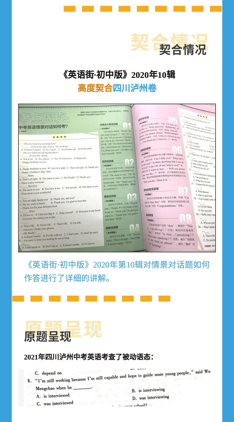 《英语街初中版》的内容集知识性、趣味性和互动性为一体。部分栏目更是由全国双语教材中心的专家和英美外籍教师亲自担纲并精心打造。它是最新最流行的时尚文化集结地,最好玩最可乐的信息汇集地,最感人最轰动的美文大本营,最全面最实用的考试技巧点拨所,也是最贴近中考最轻松的英语阅读学习资料。
