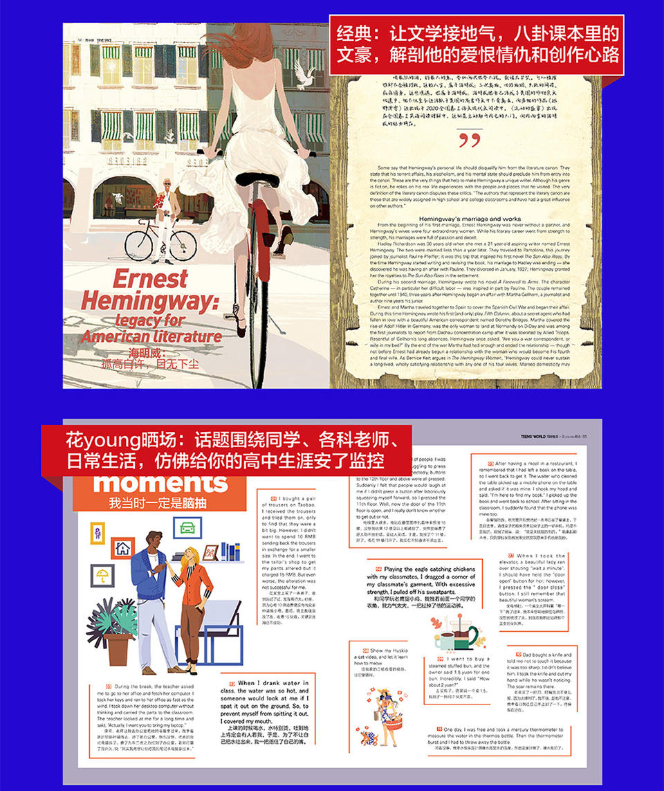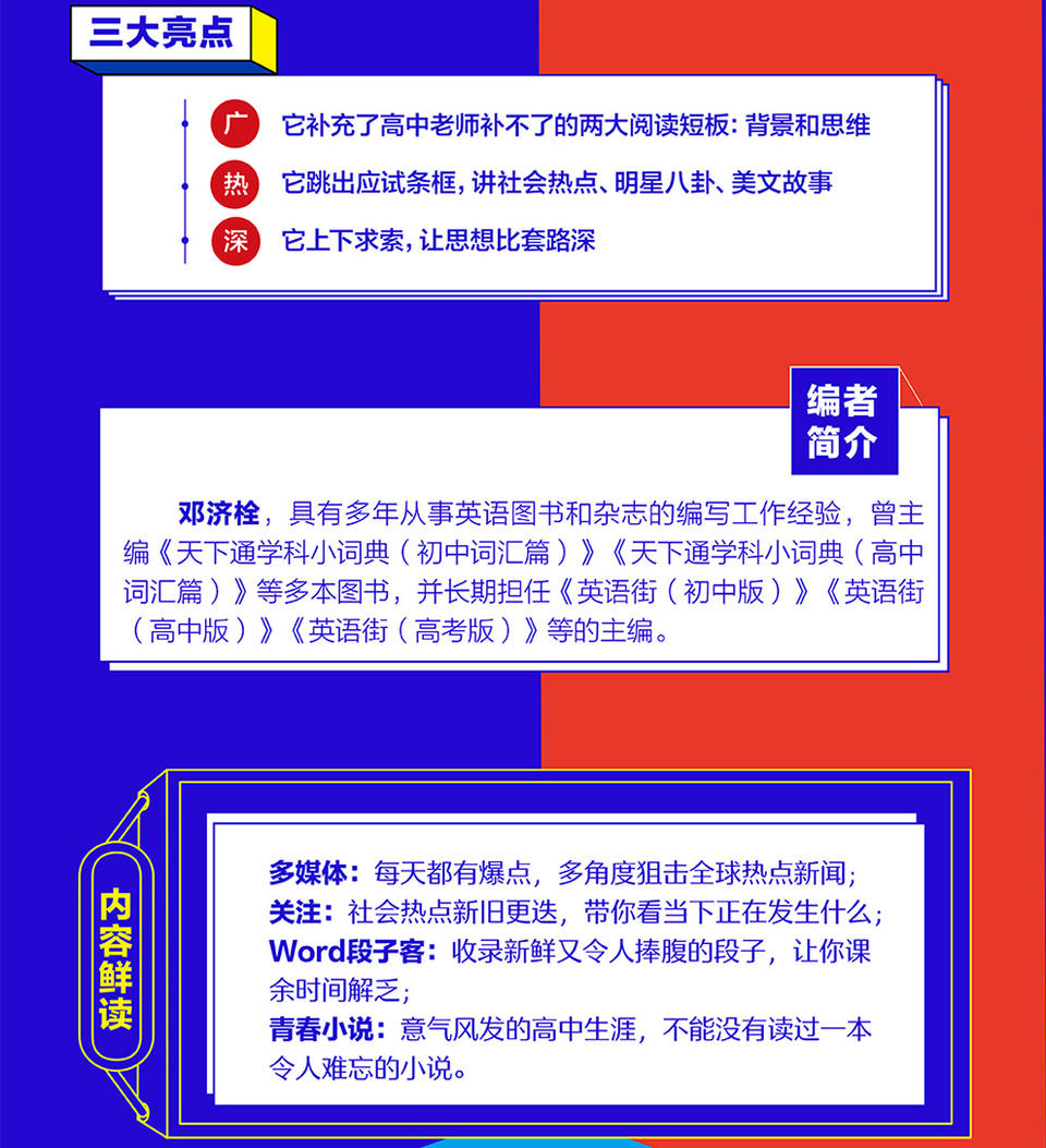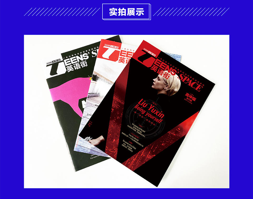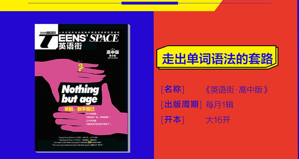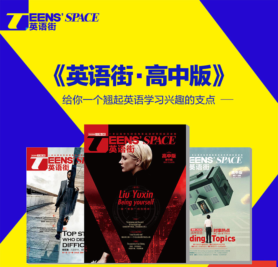 《英语街》(高中版)由数百位英美籍教师和双语教学专家亲自担纲并精心打造。它是一本16开64页彩色精美印刷的专为高中生量身打造的青春时尚英语学习杂志,它集知识性、趣味性、时尚性、权威性、互动性为一体。它以高中生的视角来阅读世界,感知世界。它是最新最流行的时尚文化集结地,最好玩最可乐的信息汇集地,最感人最轰动的美文大本营,最全面最实用的考试技巧点拨所,也是最贴近高考最轻松的英语阅读学习资料。