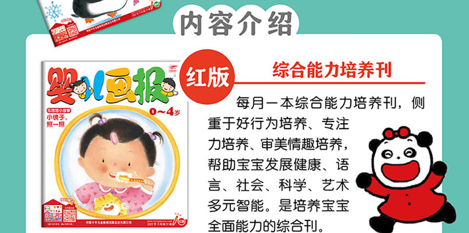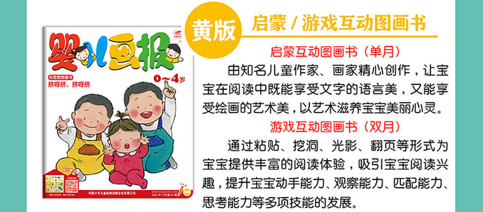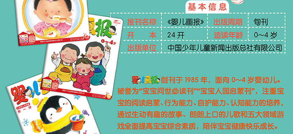 《婴儿画报》为0-4岁的婴儿提供最佳阅读内容,打造婴儿杂志第一品牌。《婴儿画报》强调知识性和教育性,以教育部《幼儿园教育大纲》为指导,以培养聪明健康的宝宝为目的,以快乐教育和游戏教育为手段,着力于宝宝的好品质培养、好习惯培养、认知能力培养、行为能力培养、想像力培养;将教育元素通俗化,让家长更容易接受。《婴儿画报》画面大、文字大、形象可爱、色彩鲜明,是婴儿阅读启蒙的首选。