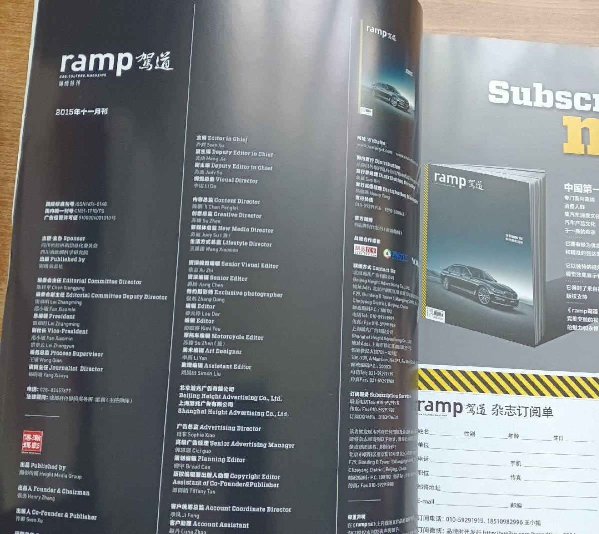 《ramp驾道》是一本以文化和生活方式为出发点、高度重视文字和视觉品质的汽车类杂志 《ramp驾道》谈汽车,更爱谈它的前生今世,谈它凝聚的爱恨情仇,谈它为生活带来的改变,谈它的文化表现和与它相关的生活方式。在《ramp驾道》眼中,汽车不仅仅是人类技术高度发展的产物,更是有着丰富的性格和多样的角色。为展示汽车的这种精彩,《ramp驾道》不遗余力地追求用高品质的文字和极具视觉冲击力的图片捕捉汽车最为动人的瞬间并将其跃然呈现,以期将一个个汽车故事深深地带入读者心中。 《ramp驾道》是一本透过产品表象深入挖掘、展示汽车品牌和产品的文化内涵及附加价值的杂志 《ramp驾道》不仅善于通过独到的视角发现汽车的美,更擅长深入高端品牌和产品背后,从中寻找那些为其带来辉煌并被延续至今的品牌精髓,以及造就其不朽传奇的产品与人物。通过对这些附加价值的再现与全新演绎,《ramp驾道》可以帮助品牌从同类产品中脱颖而出,并进而在汽车品牌和高端消费者之间建立起沟通的桥梁。 《ramp驾道》是一本代表着国内最先进编辑理念和最高制作水准、专为中国高端汽车消费者量身定制的杂志 《ramp驾道》将对汽车的痴迷与对杂志的激情结合在一起,力图凭借感人的文字、精美的图片、华丽的视觉效果和出众的制作工艺,为读者上奉上一份以汽车为主角、以汽车文化为绚丽背景的视觉盛宴。确保了即使那些对不熟悉汽车的读者,也能沉醉其中,获得美好的阅读体验。 《ramp驾道》是一本和高端目标群体有着高度沟通和互动的汽车类杂志 《ramp驾道》有着独特而精准的发行渠道。这些包括全国各地超级跑车俱乐部在内的渠道可以帮助《ramp驾道》及时有效地到达高端汽车品牌的目标客户手中。与此同时,《ramp驾道》还通过包括车主采访在内的固定栏目、车主聚会等车主活动以及微博传播等新媒体形式与高端读者进行着丰富而深入的互动,从而在读者、杂志和高端汽车品牌之间建立起了立体而密切的联系。