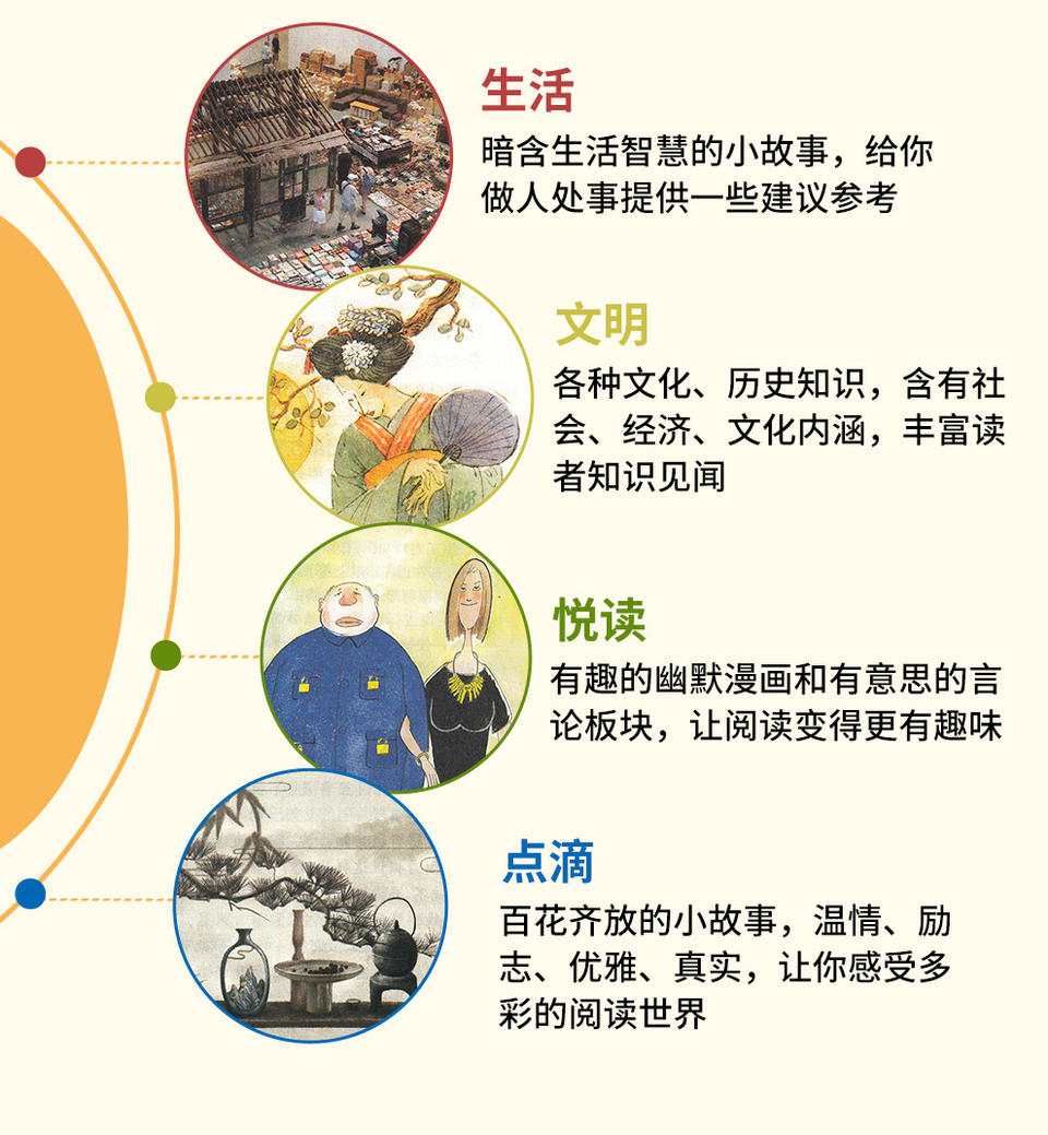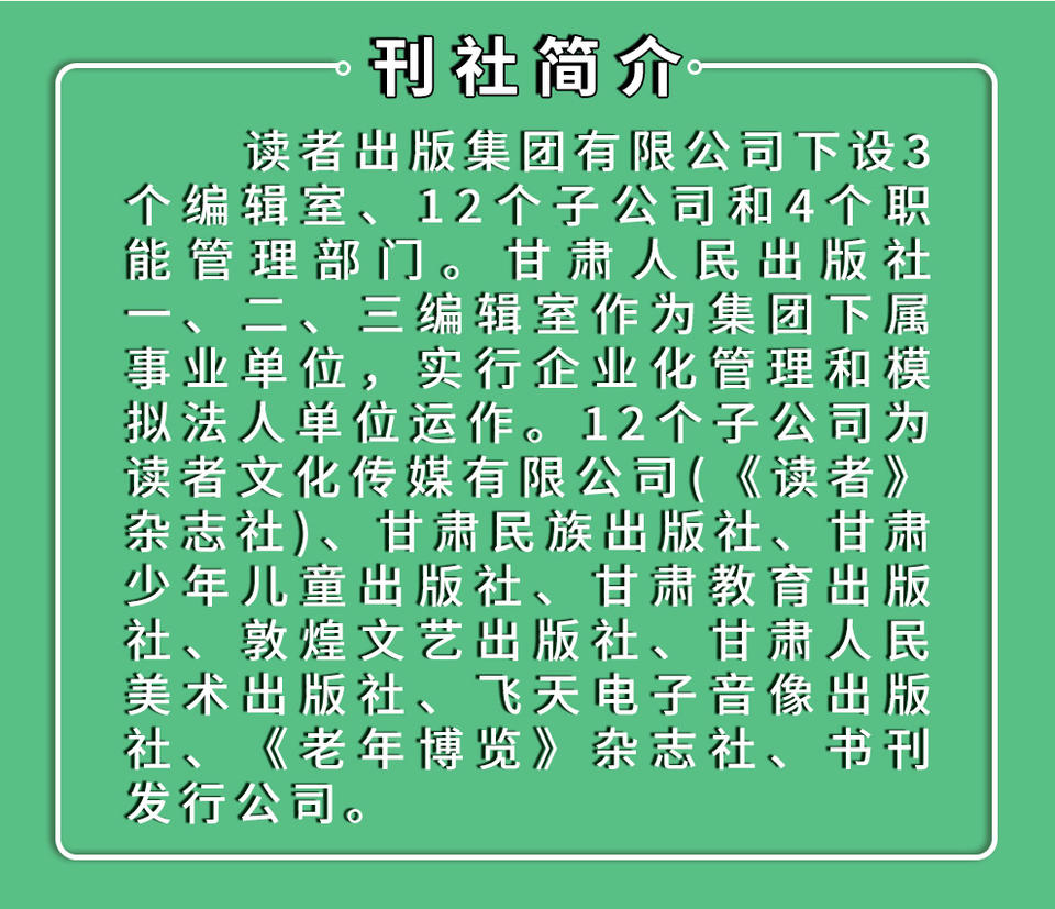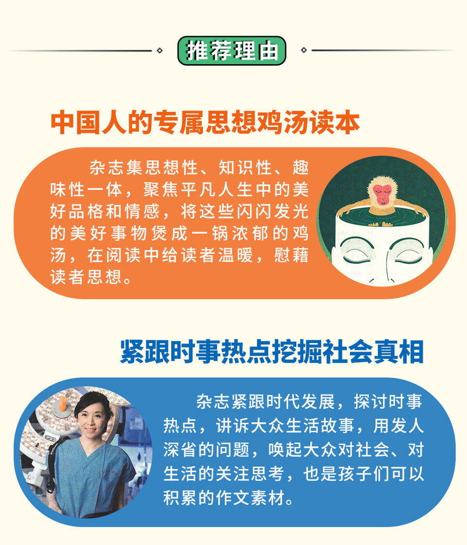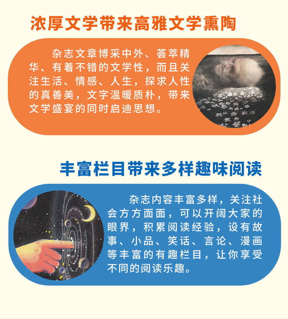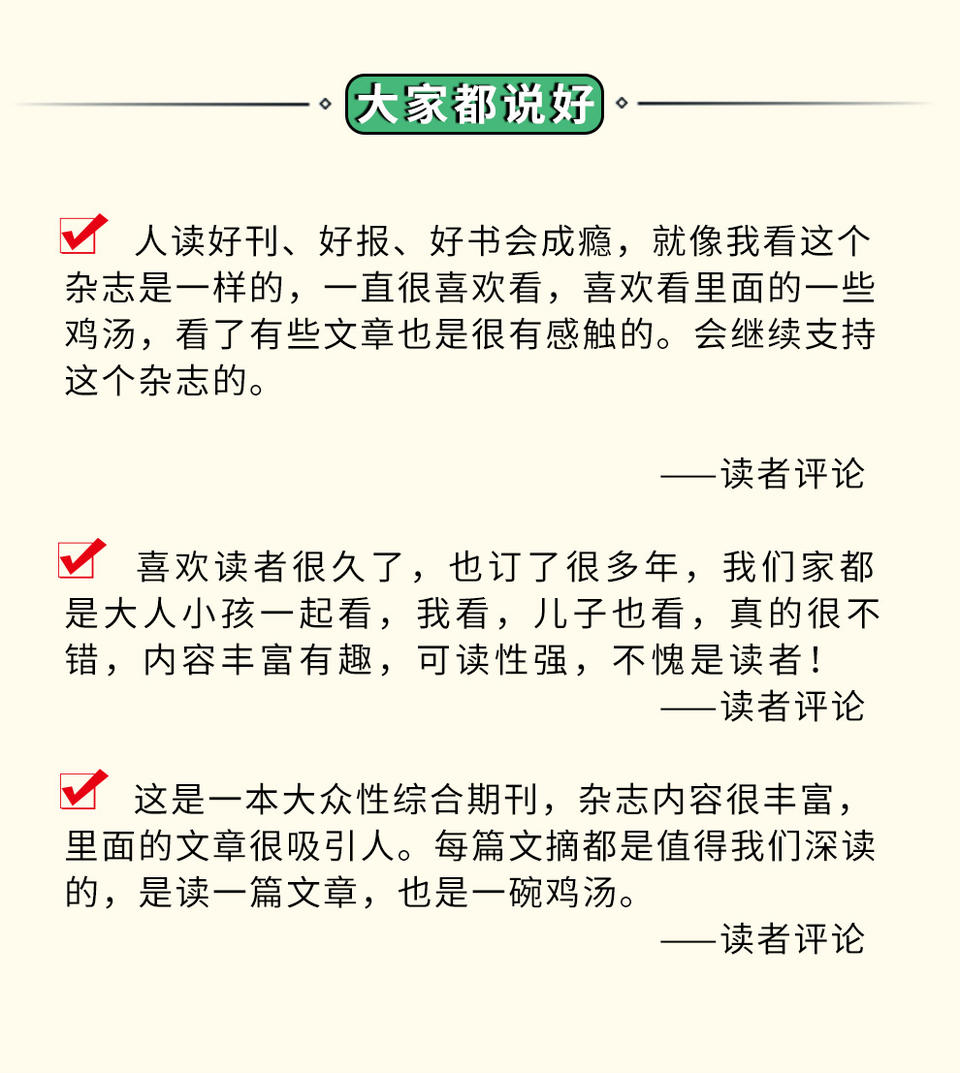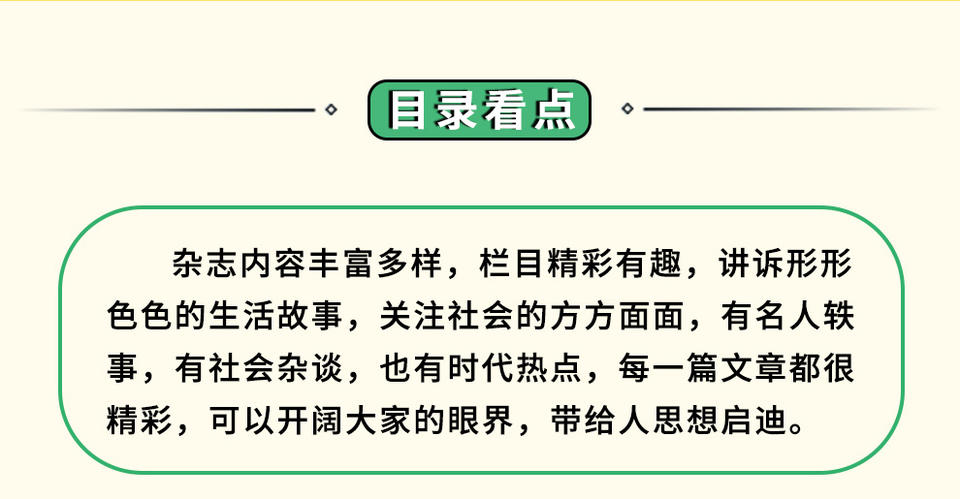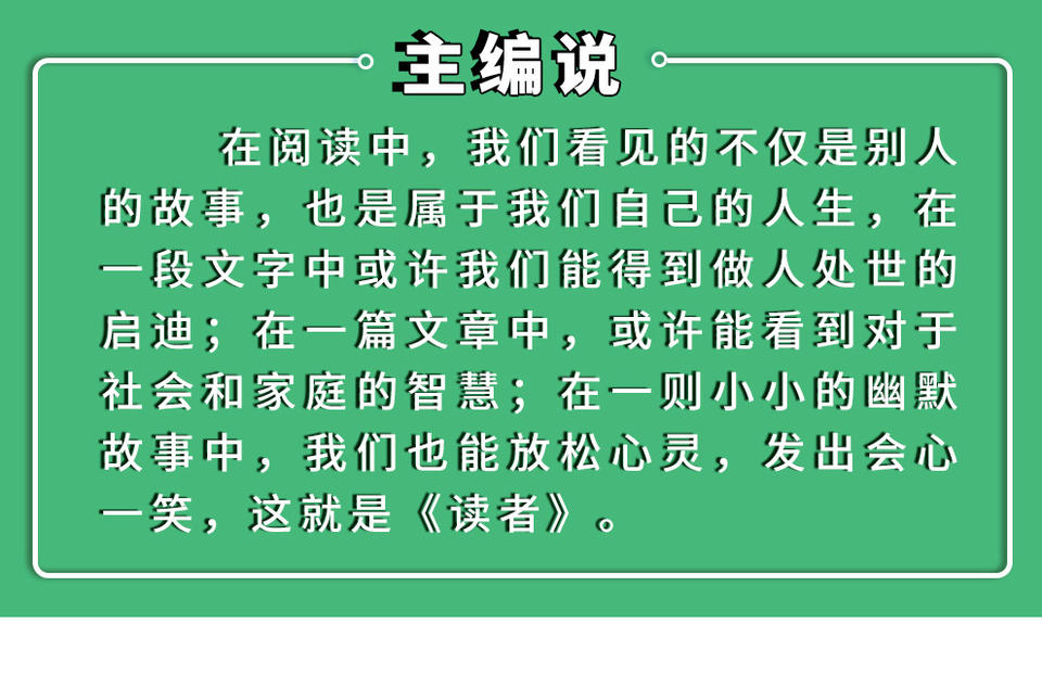 《读者》收录的文章融思想性、知识性、趣味性为一体;追求高品质、高质量、篇篇精品。这里有正确的思想,高尚的道德、崇高的理想生活的哲理,使读者在轻松、愉快的阅读中陶治情操,净化心灵,适合各个年龄段的读者阅读。
