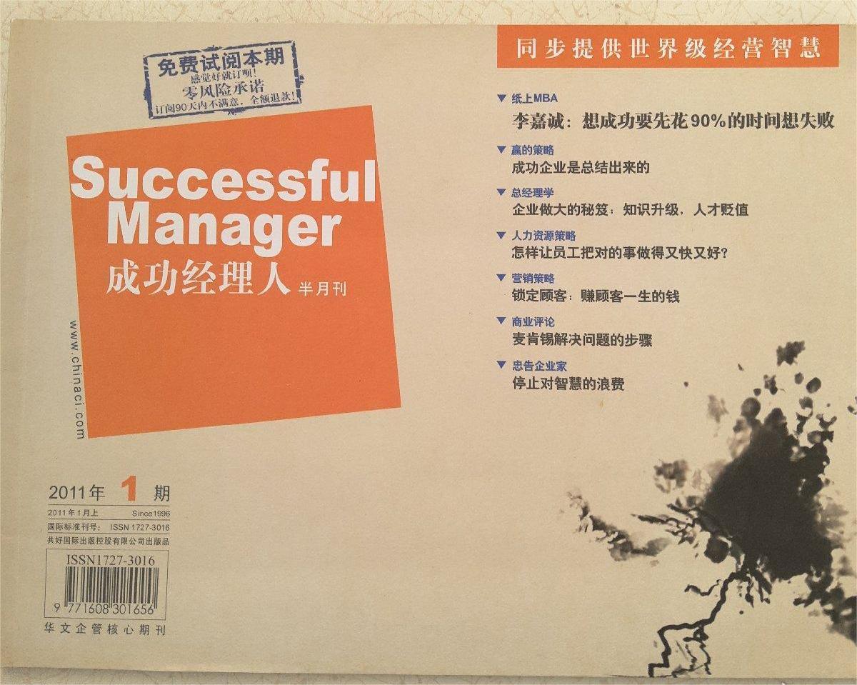 《成功经理人》(SuccessfulManager)半月刊由2006年“世界杰出华人奖”获得者姜承刚先生创办于1996年,刊物以提升企业的经营管 理水平,解决企业经营的定位、方向及战略问题,帮助中国企业做强做大为宗旨。内容框架是依据共好集团对国内外数万家企业的调研和分析,总结出企业经营管理 最常遇到的问题,并用精粹文摘的方式提出解决方案,并对解决方案的优劣做出权威点评的系统性读物。