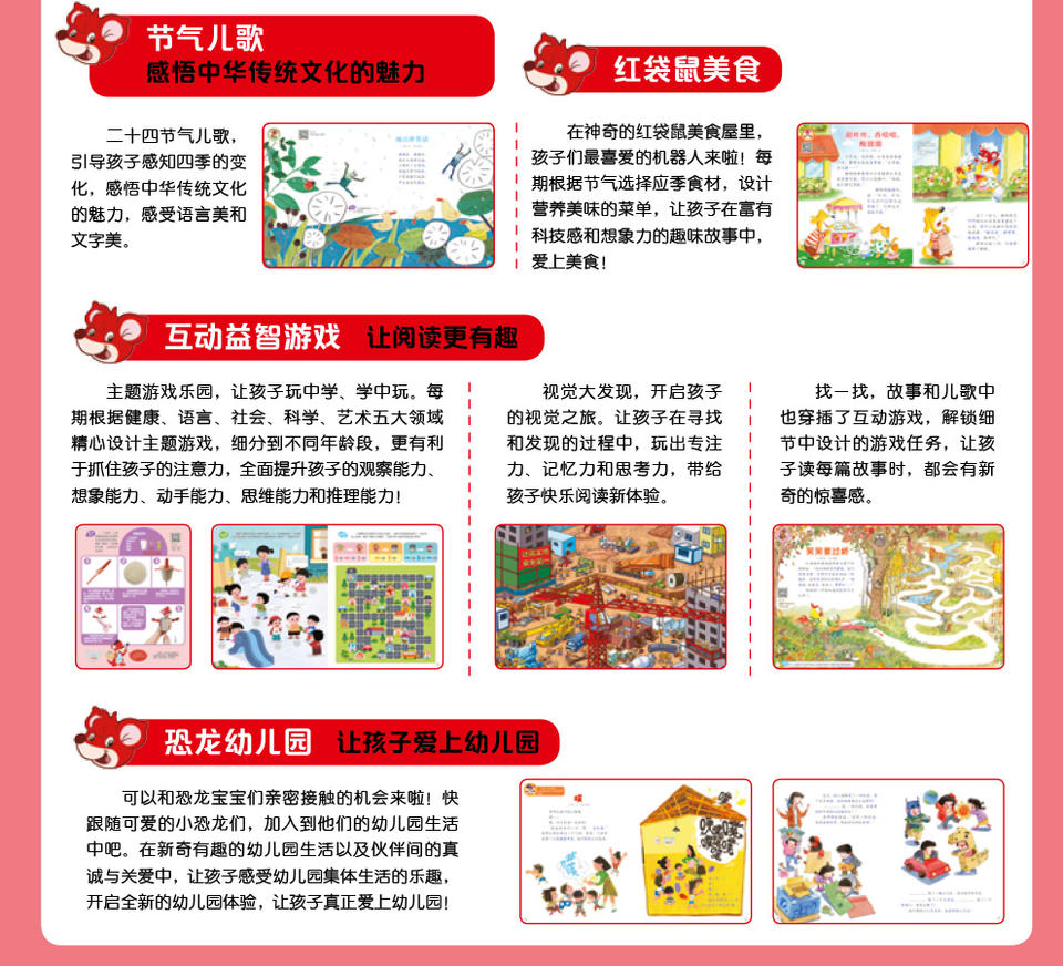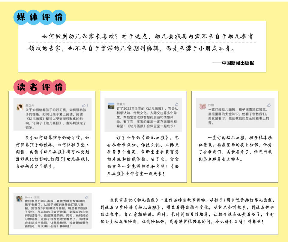 《幼儿画报》以教育部颁布的《幼儿园教育指导纲要》为指导,树立高度的责任感,创设适合中国幼儿身心发展的栏目及内容,如:“红袋鼠的自我保护故事” “好习惯故事” “宝宝唱成语故事” “奥运城堡漫游记”等栏目。每篇故事均由著名幼儿教育专家指导, 保证了《幼儿画报》的专业性和权威性。